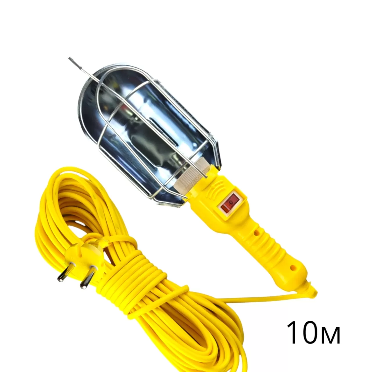Гаражный светильник с проводом 10 метров оборудован клавишным выключателем, металлическим рассеивателем, а также защитной стальной решеткой.