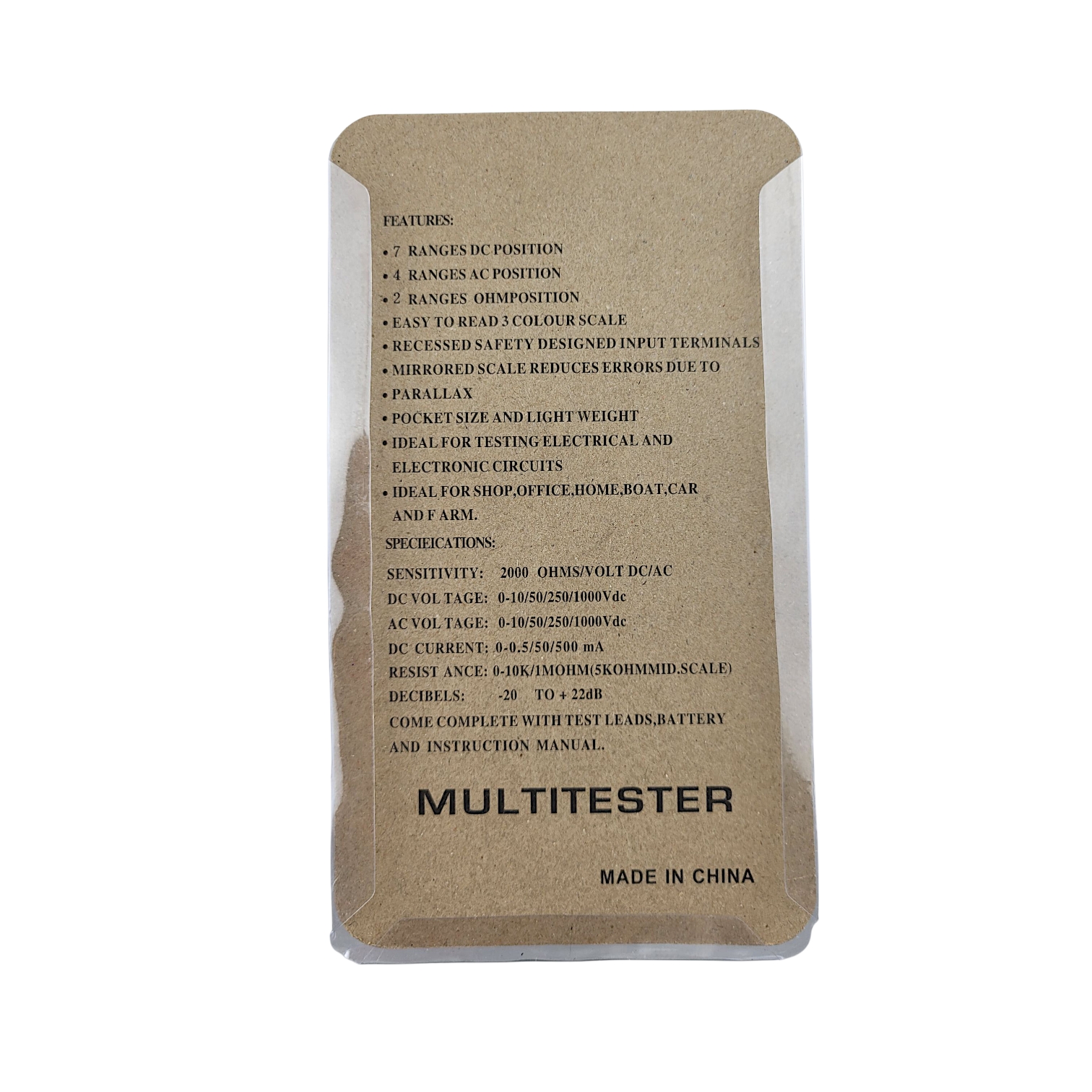 Поставляется в комплекте с тестовыми проводами 40 см., батареей и инструкцией по эксплуатации.